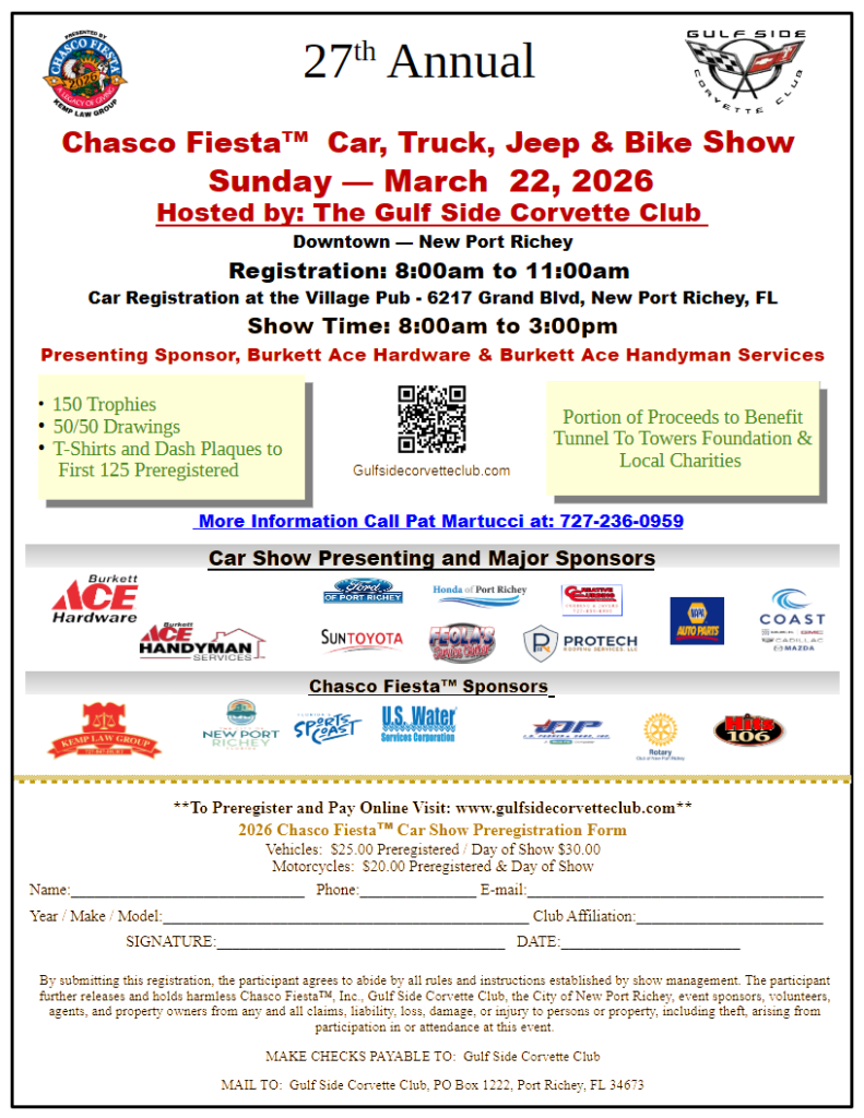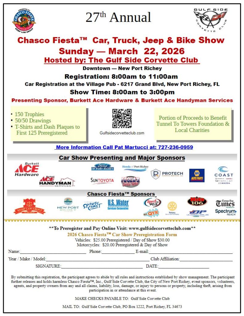 The 27th Annual Chasco Fiesta Car Show is right around the corner. Sunday, March 22, 2026, on the streets of beautiful downtown New Port Richey. Preregister soon, the first 125 registrations get a free t-shirt and dash plaques.
