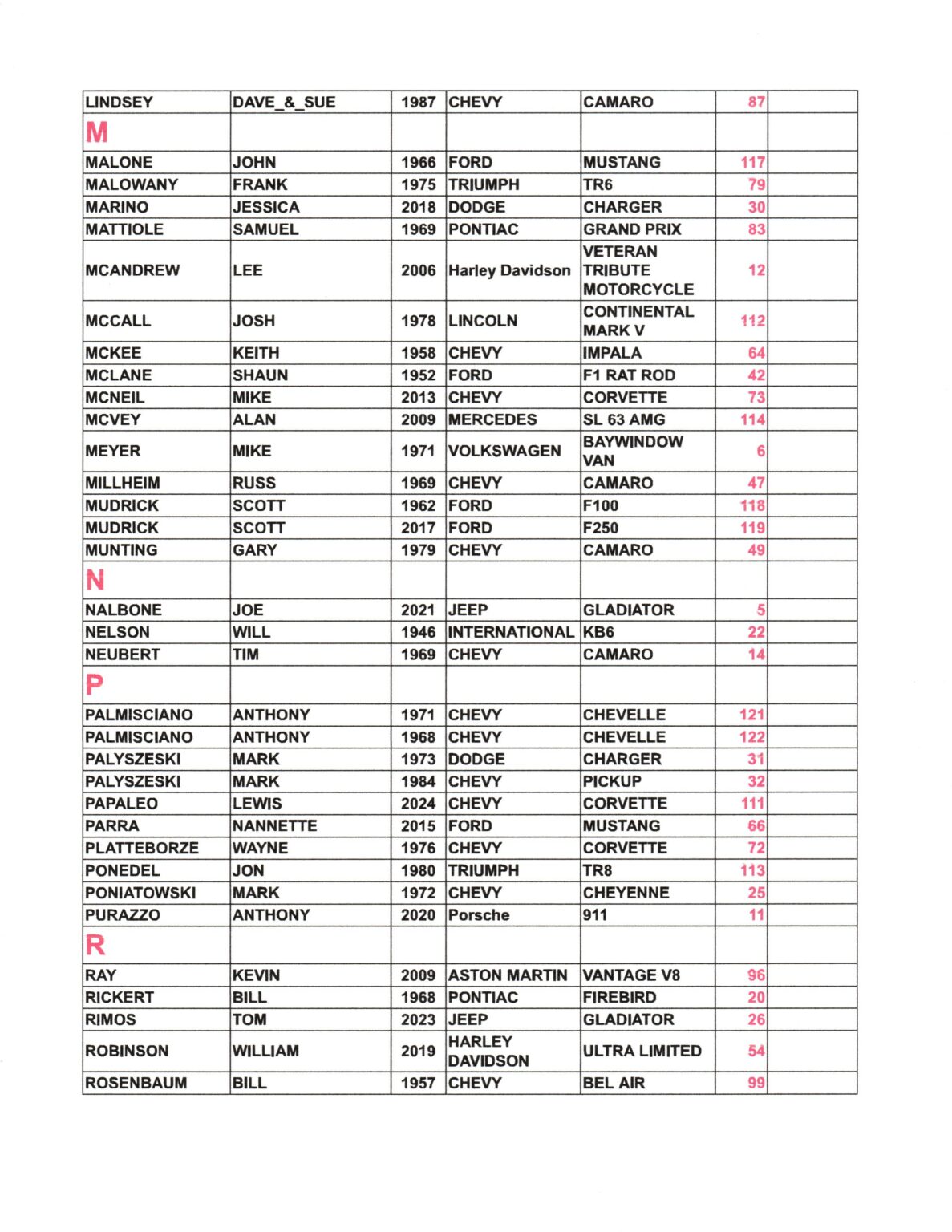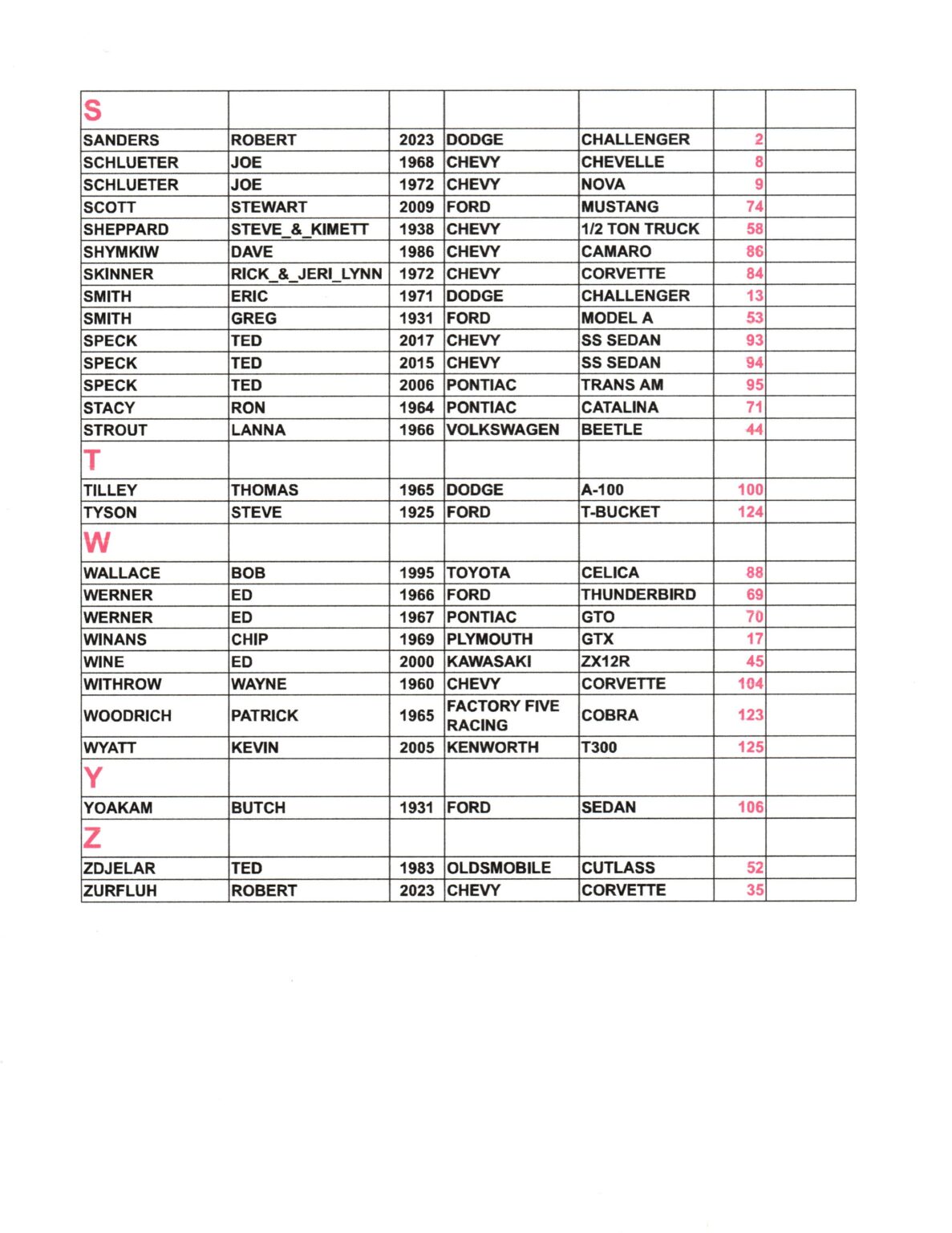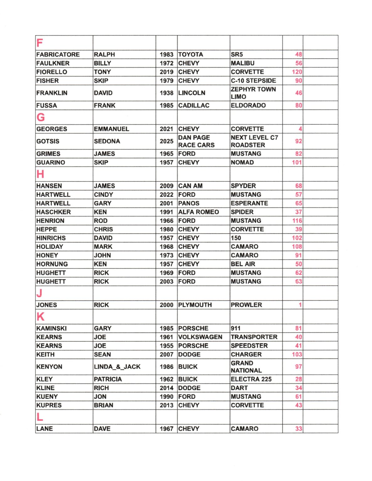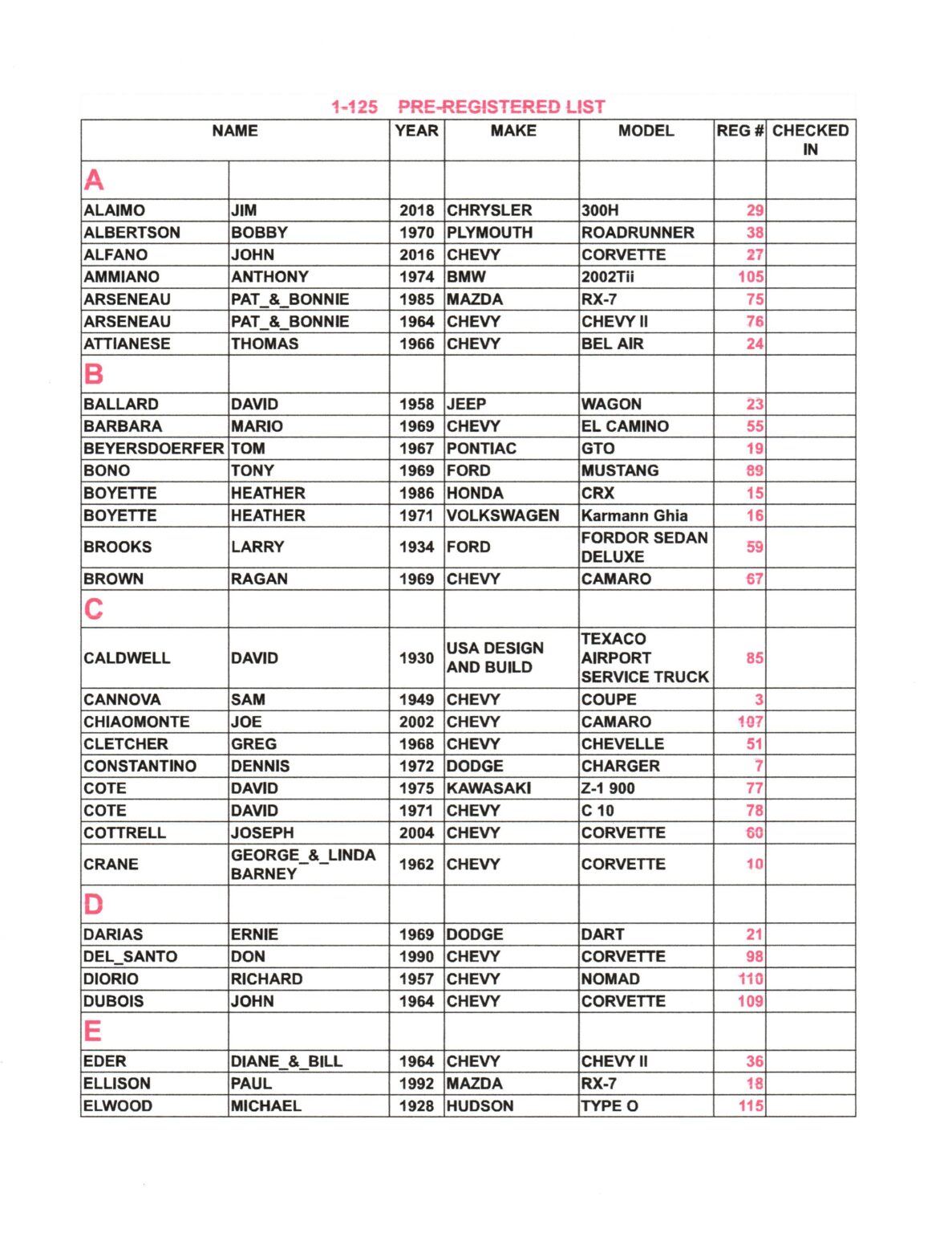 The following list indicates the people who preregistered for the Chasco Fiesta Car Show.  One of the benefits of the first 125 preregistered people receive a complimentary t-shirt.  If you were one of the first 125 people (see REG # column) and did not get a t-shirt please contact Pat Martucci at gulfsidecorvettes@yahoo.com or call 727-236-0959. Thanks again for preregistering and remember the Trinity Car, Truck and Jeep Show is November 8th.